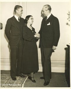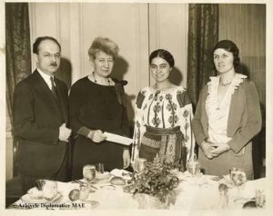 în prima fotografie, Smaranda Brăescu este felicitată de Carol A. Davila, trimis extraordinar și ministru plenipotențiar al României la Washington în perioada 1929-1938,