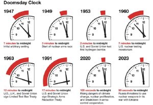 «Ceasul Apocalipsei» (în engleză «Doomsday Clock»), creat în 1947, este setat anual de către cercetători și semnifică cât de aproape este omenirea de o catastrofă globală, cauzată de declanșarea unui război nuclear. De anul trecut, ceasul este setat la „90 de secunde până la dezastru”, cel mai redus interval de timp, de la 1947 încoace. După numărul mare de provocări pe care le observăm în arena geopolitică internațională în acest an, se poate prognoza că resetarea ceasului ar putea indica chiar „30 de secunde până la dezastru”, adică iminența unui război nuclear.