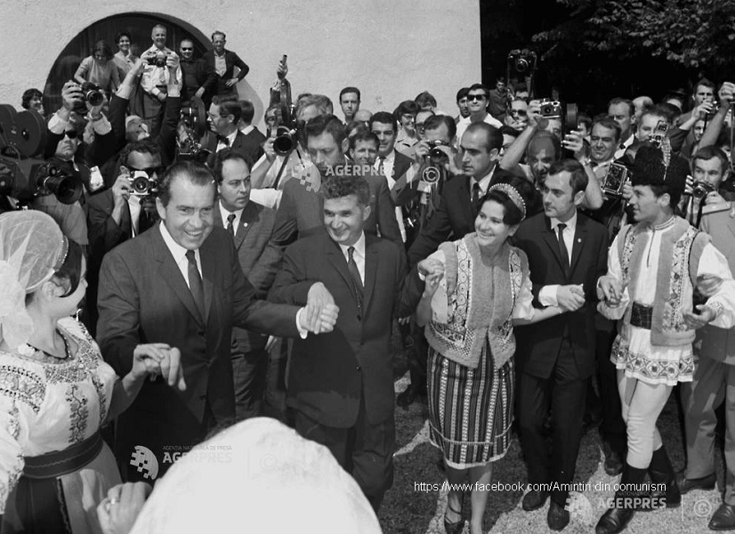 În foto este președintele american Richard Nixon dansând perinița împreună cu președintele român Nicolae Ceaușescu, la Muzeul Satului din București, în cursul vizitei sale istorice în România în 1969, chiar în primul său an de mandat. A fost prima vizită a unui președinte american în România și totodată prima vizită într-o țară comunistă a unui președinte american.